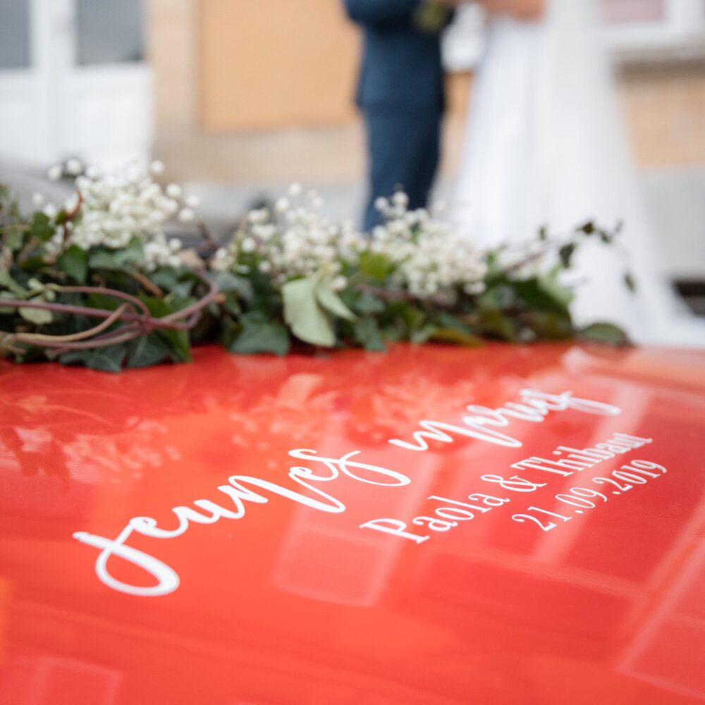 • 1 Wedding Car Window Decal featuring Signature “Jeunes Mariés” design + personalized names & date