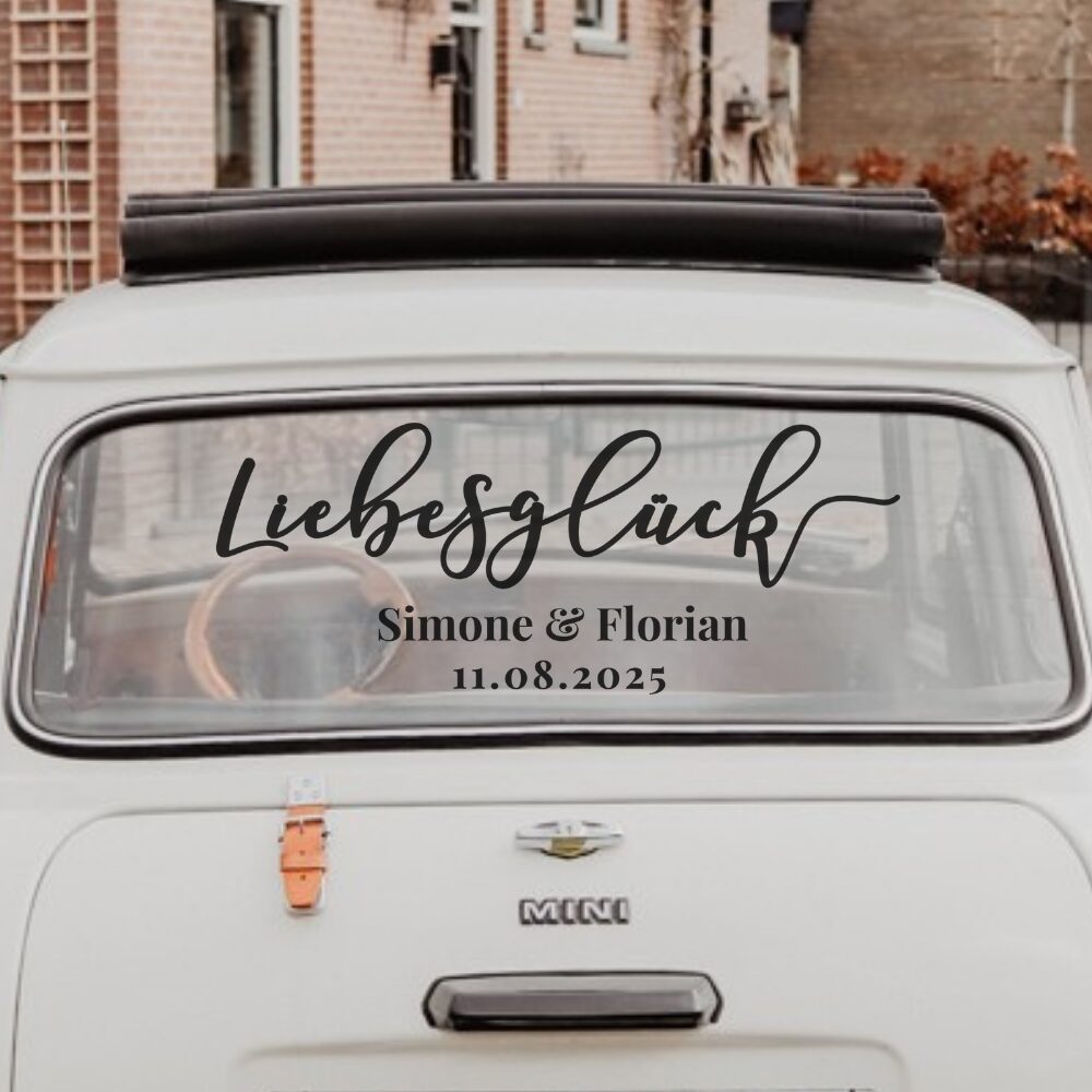 • 1 Wedding Car Window Decal featuring the “Liebesglück” design + personalized names & date