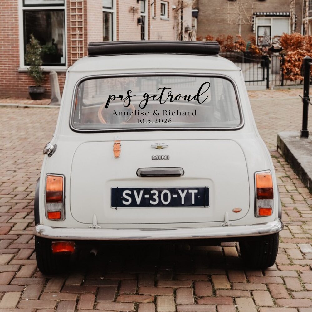 • 1 Wedding Car Window Decal featuring Signature “Pas Getroud” design + personalized names & date