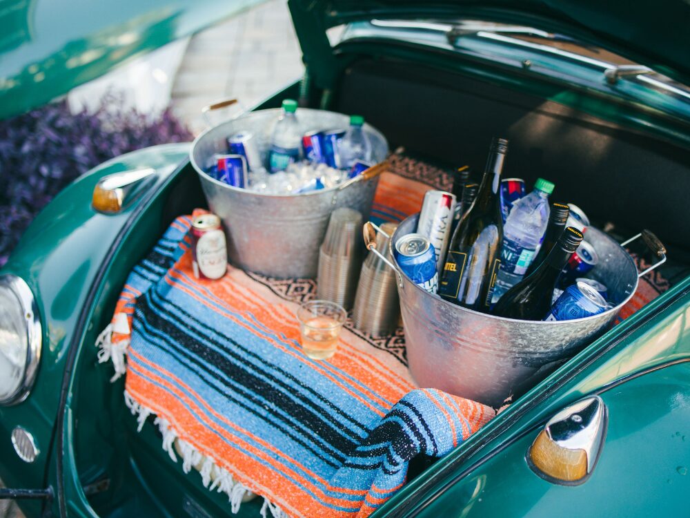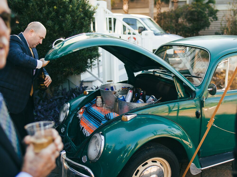 One of the most memorable ideas from this wedding was using the front boot of Lucy the Love Bug as a welcome drinks bar.